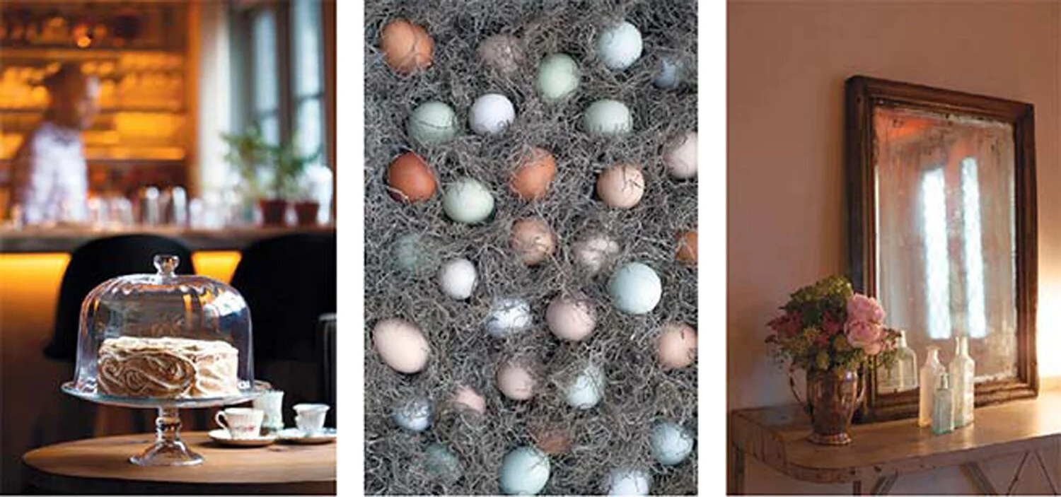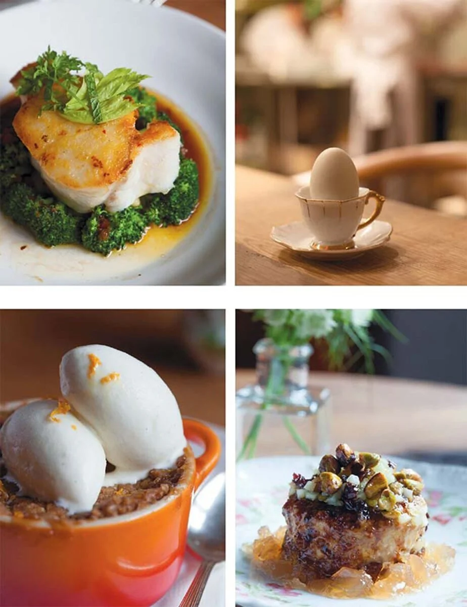 Below: Clockwise, from top left: roasted hake with tender broccoli, grated ginger dressing and topped with chervil and mint; a local egg from the chef ’s table; foie gras brulée with dried sour cherries, candied pistachios and white port gelée; Muscovado rhubarb crisp with Scottish oat topping